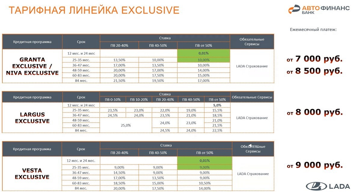 9 000 руб. — ежемесячный платеж по кредиту в АО «Авто Финанс Банк» (лицензия Банка России №170 от 06.09.2023 г.) по программе VESTA EXCLUSIVE, действующей при покупке нового автомобиля LADA Vesta (ТС) в комплектации GFL11-278-B1. Параметры расчета: стоимость ТС — 1 459 900 руб.; первоначальный взнос — 70,7%; сумма кредита — 428 200 руб.; срок кредита — 7 лет; валюта — рубли РФ; ПСК — от 0,149% до 45,000% годовых; ставка в договоре — 18,00%. Расчет платежа произведен на 25 декабря 2024 г., является предварительным и может отличаться от фактического при изменении параметров кредита. Предложение действует при условии единовременного оформления на ТС договора имущественного страхования КАСКО в любых страховых компаниях, выбранных заемщиком и соответствующих требованиям Банка. Возврат кредита — ежемесячные (аннуитетные) платежи. Обеспечение — залог приобретаемого автомобиля. Действительно до 31.01.2025. Предложение ограничено. Не оферта. Подробности по тел. 8-800-700-52-32.